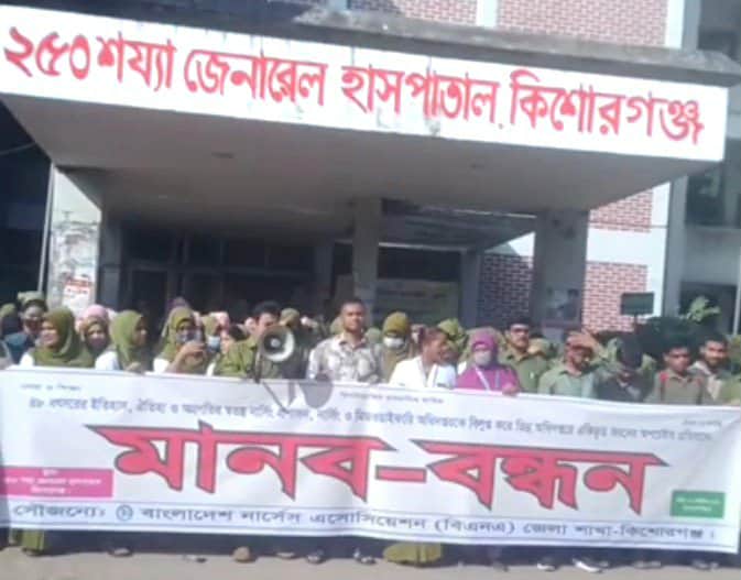 নার্সিং প্রশাসনসহ নার্সিং ও মিডওয়াইফারি অধিদপ্তরকে বিলুপ্ত করে ভিন্ন অধিদপ্তরে একীভূত করার অপচেষ্টার প্রতিবাদে কিশোরগঞ্জে মানববন্ধন কর্মসূচি পালন করেছেন বাংলাদেশ নার্সেস এসোসিয়েশন (বিএনএ) ও বাংলাদেশ মিডওয়াইফারি সোসাইটি (বিএমএস)।